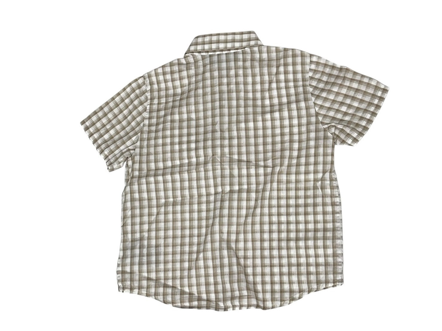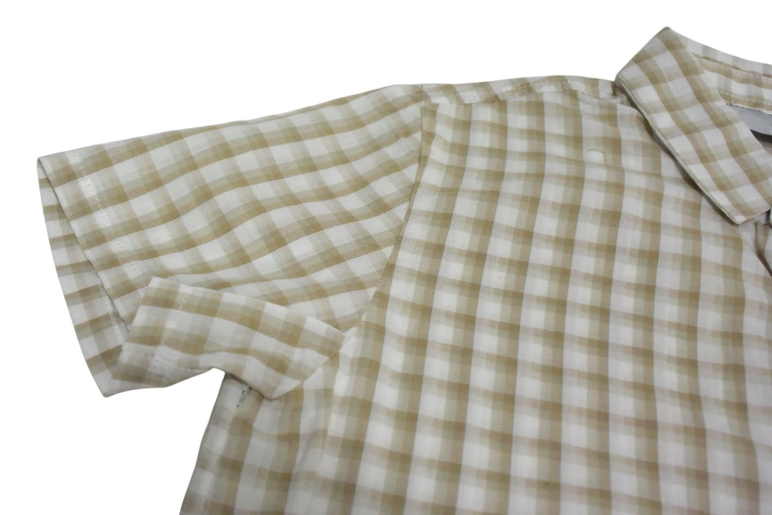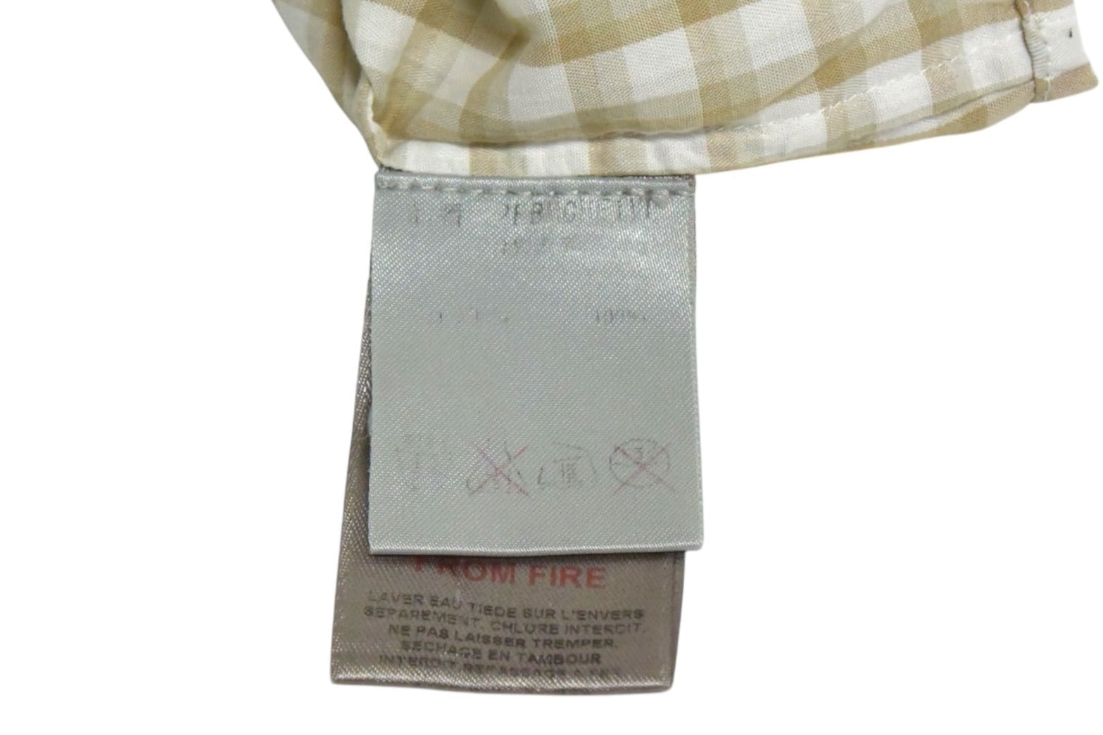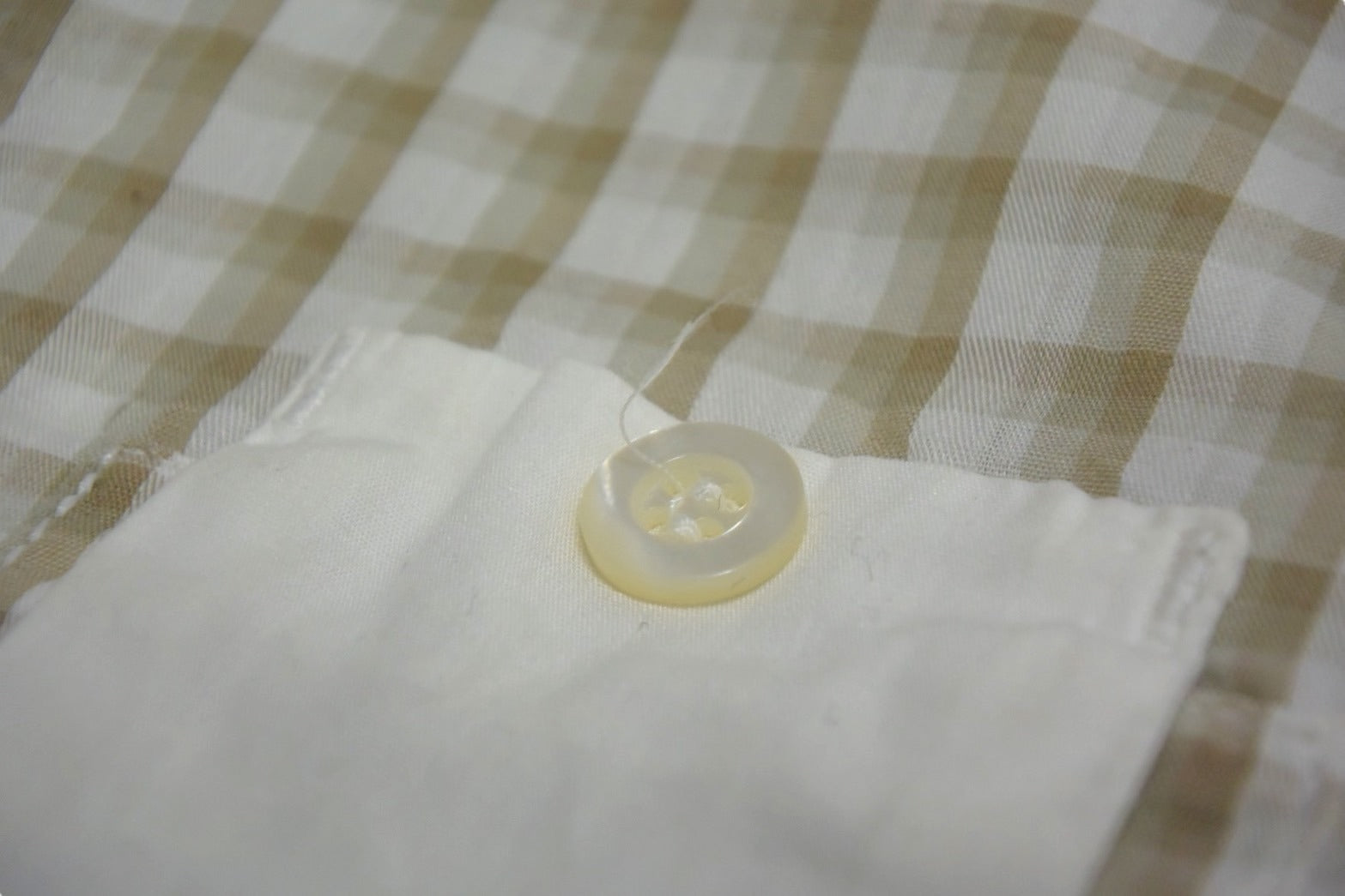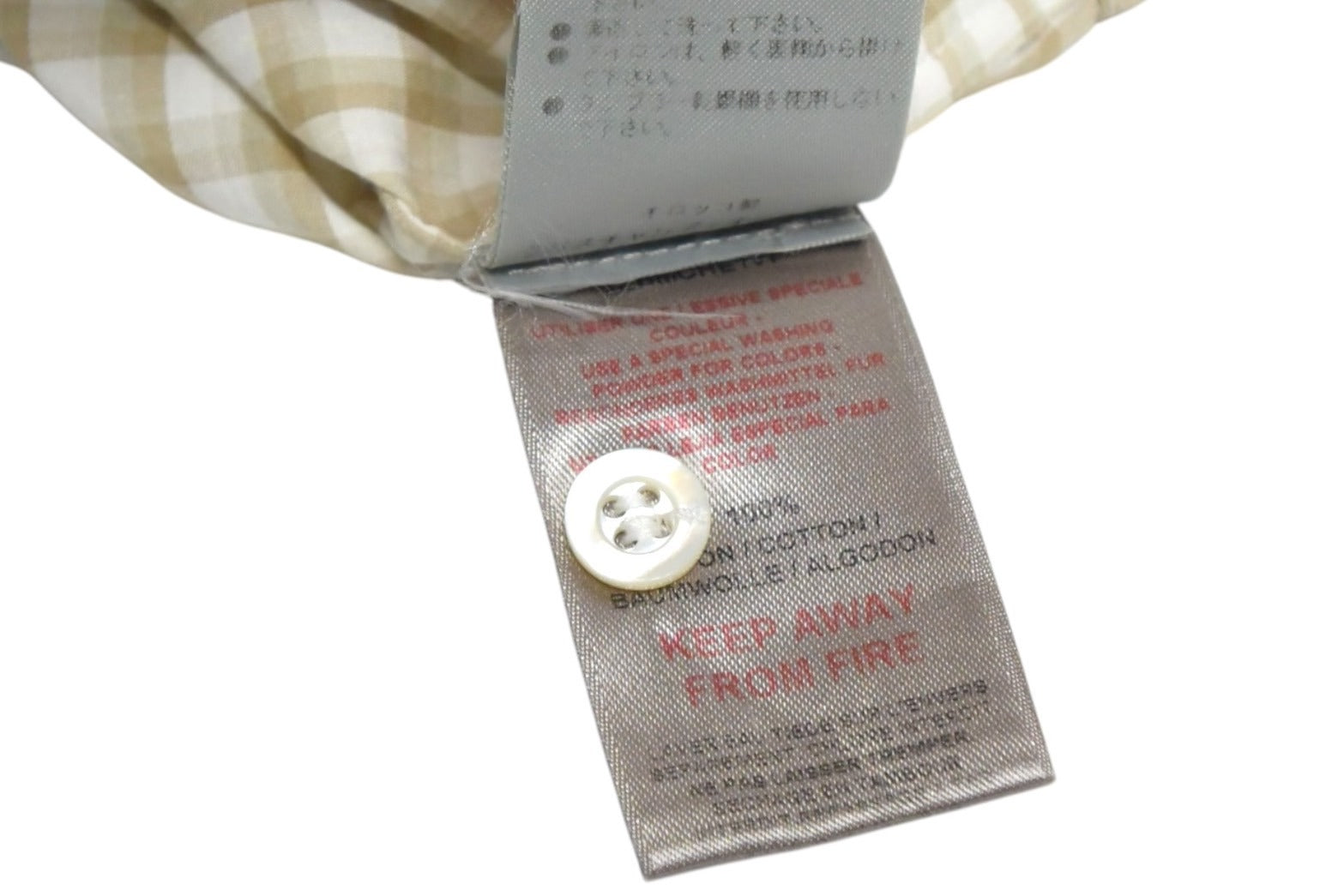 ポケットボタンに糸ほつれ、左袖形崩、右下側に小さい汚れ、タグに色あせと糸ほつれあり。そのほか目立つ汚れやダメージの少ない商品です。