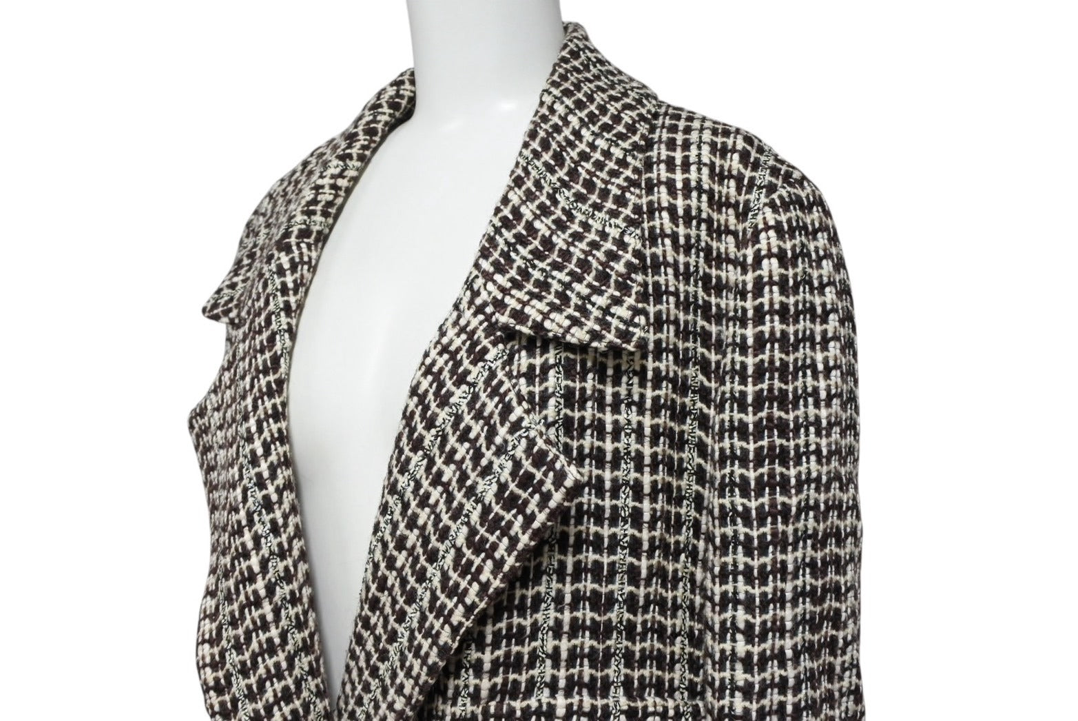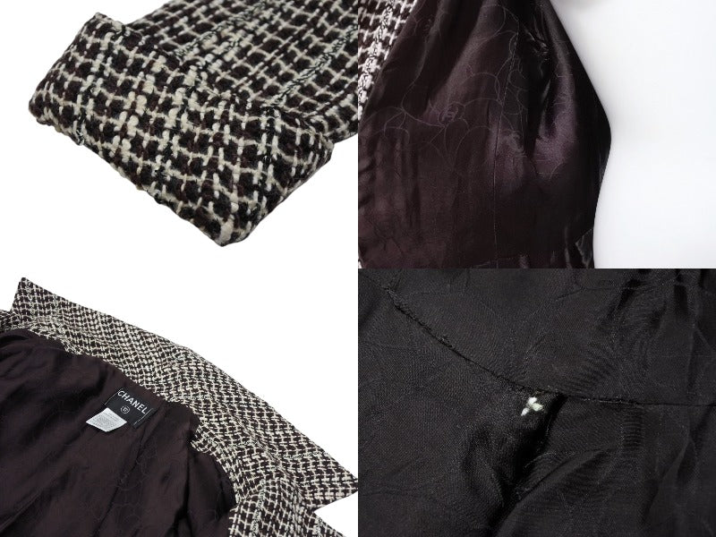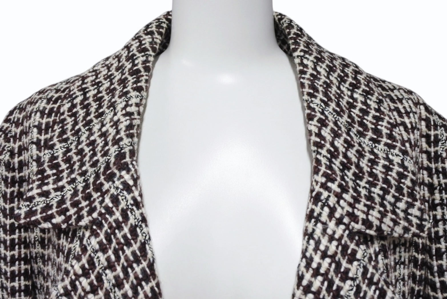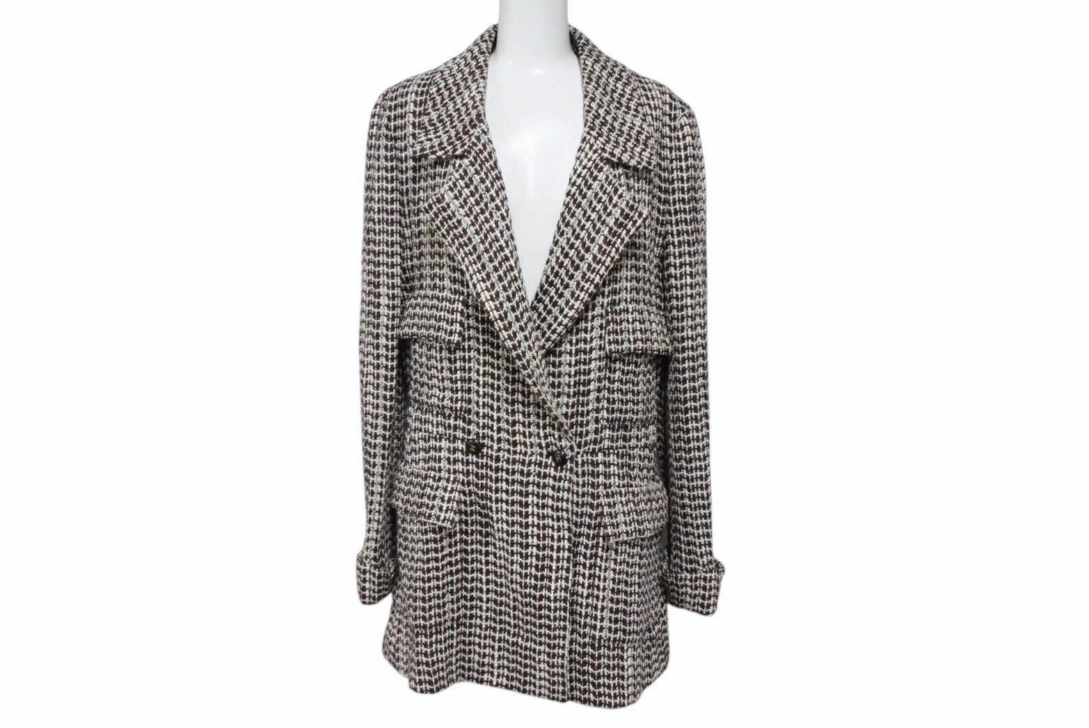 ブラウンとホワイトのツイードジャケットで上品さを感じられるアイテムです。