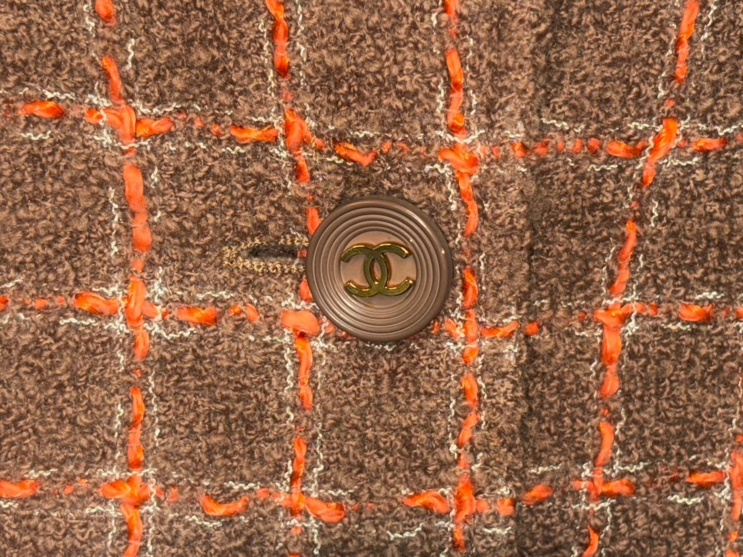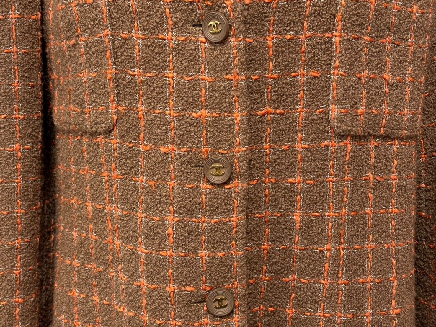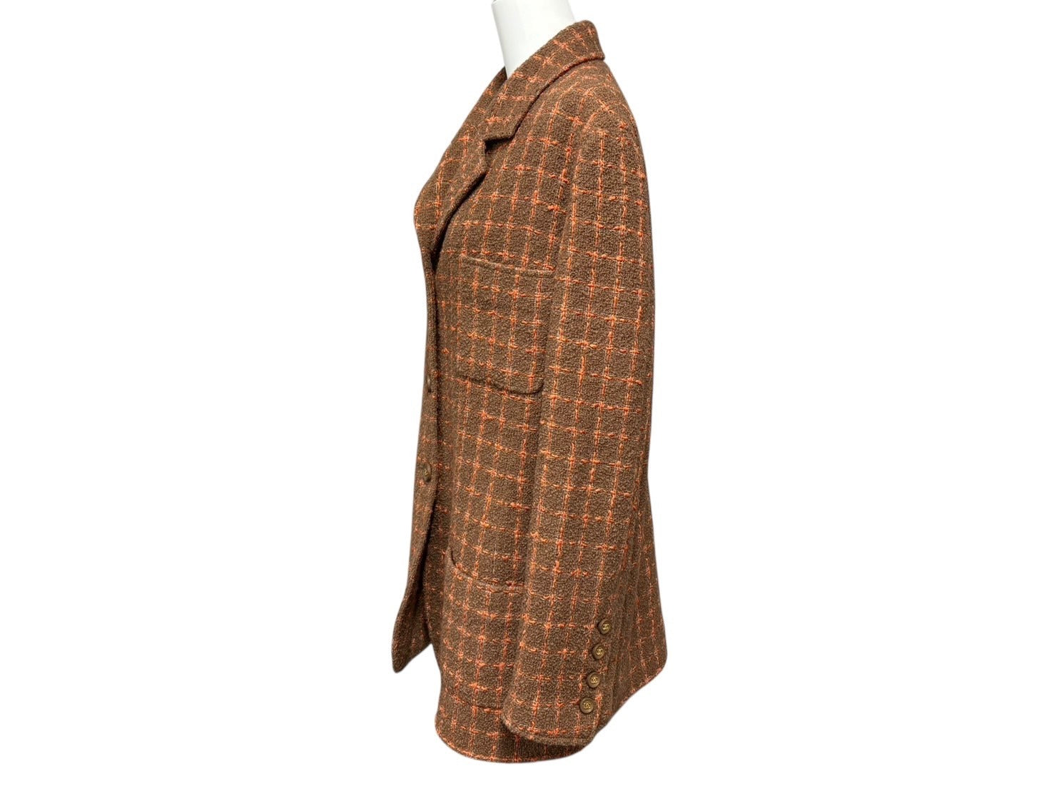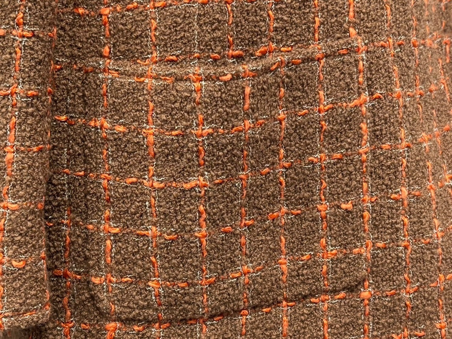 可愛らしいチェック柄が特徴的なツイードジャケットになります。