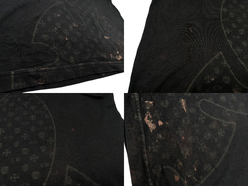 毛羽立ち、色褪せ、ブリーチ跡あり。プリントにクラックあり。首元内側に敗れ箇所あり。フロント左側部、右下部、バック下部複数汚れあり。中古品としてお使いいただける状態です。