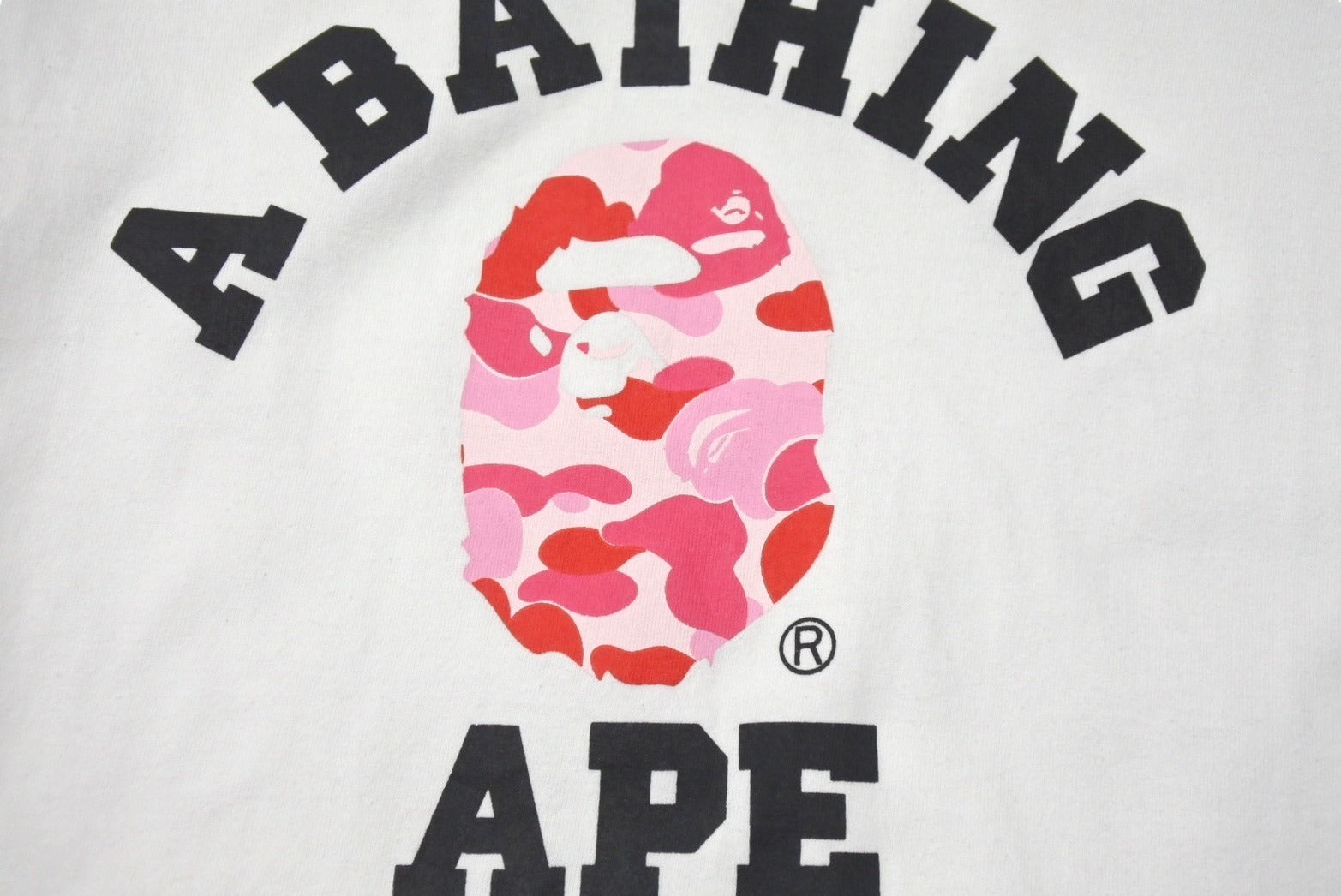 ブランドロゴやピンクカモのエイプグラフィックが目を惹く半袖Tシャツです。