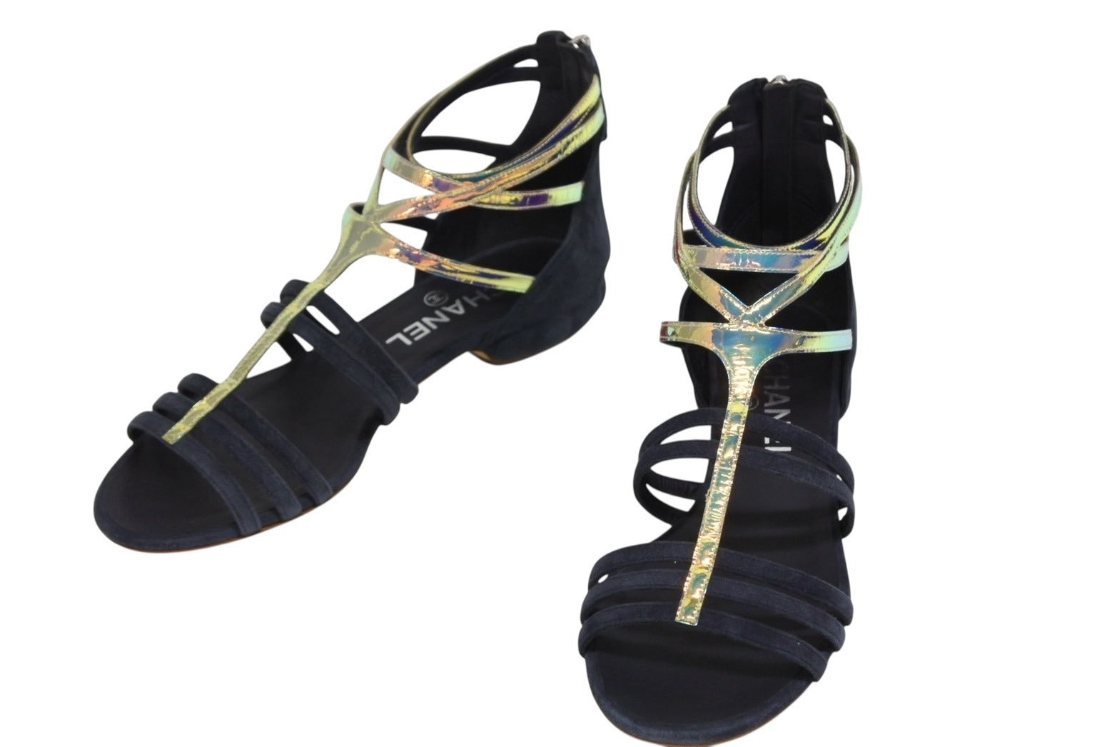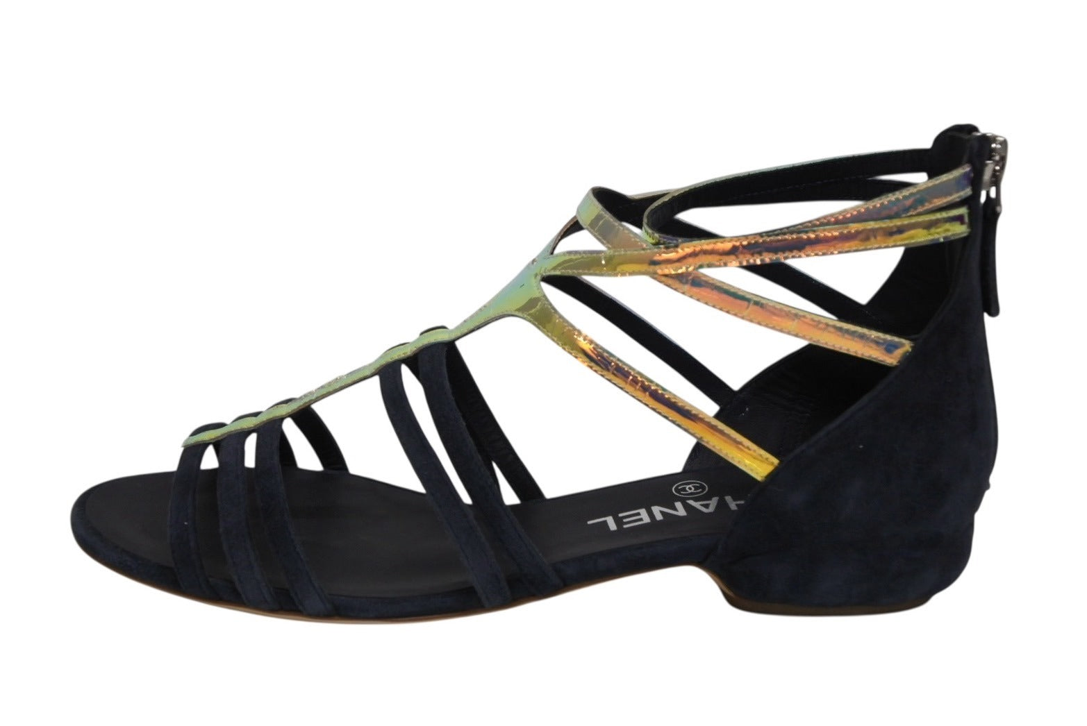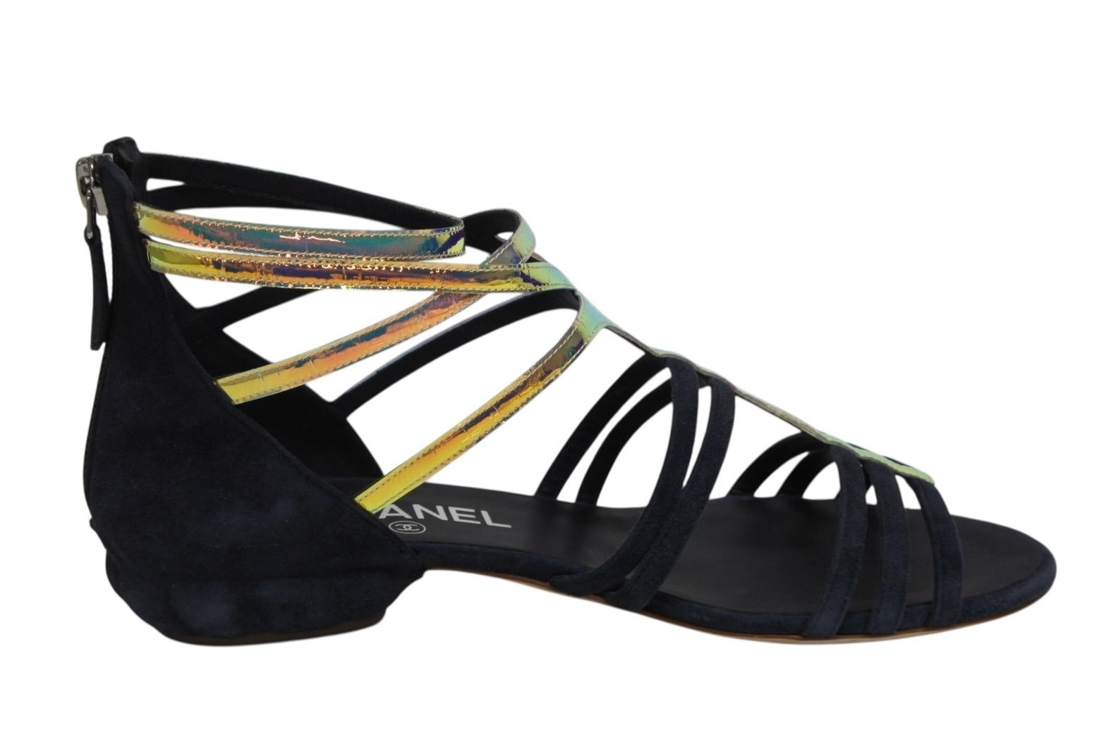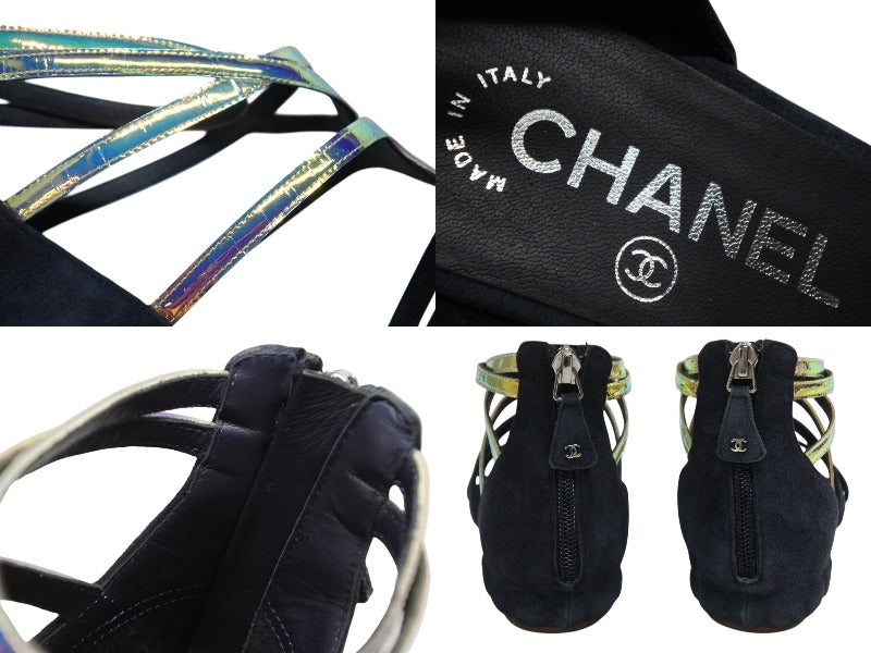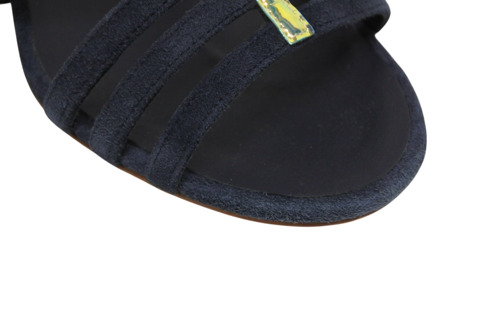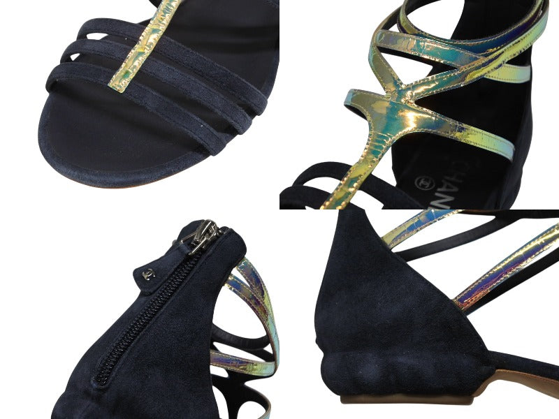 ネイビーのスエード素材にマルチカラーのストラップ部分が映える商品です。
