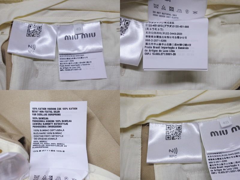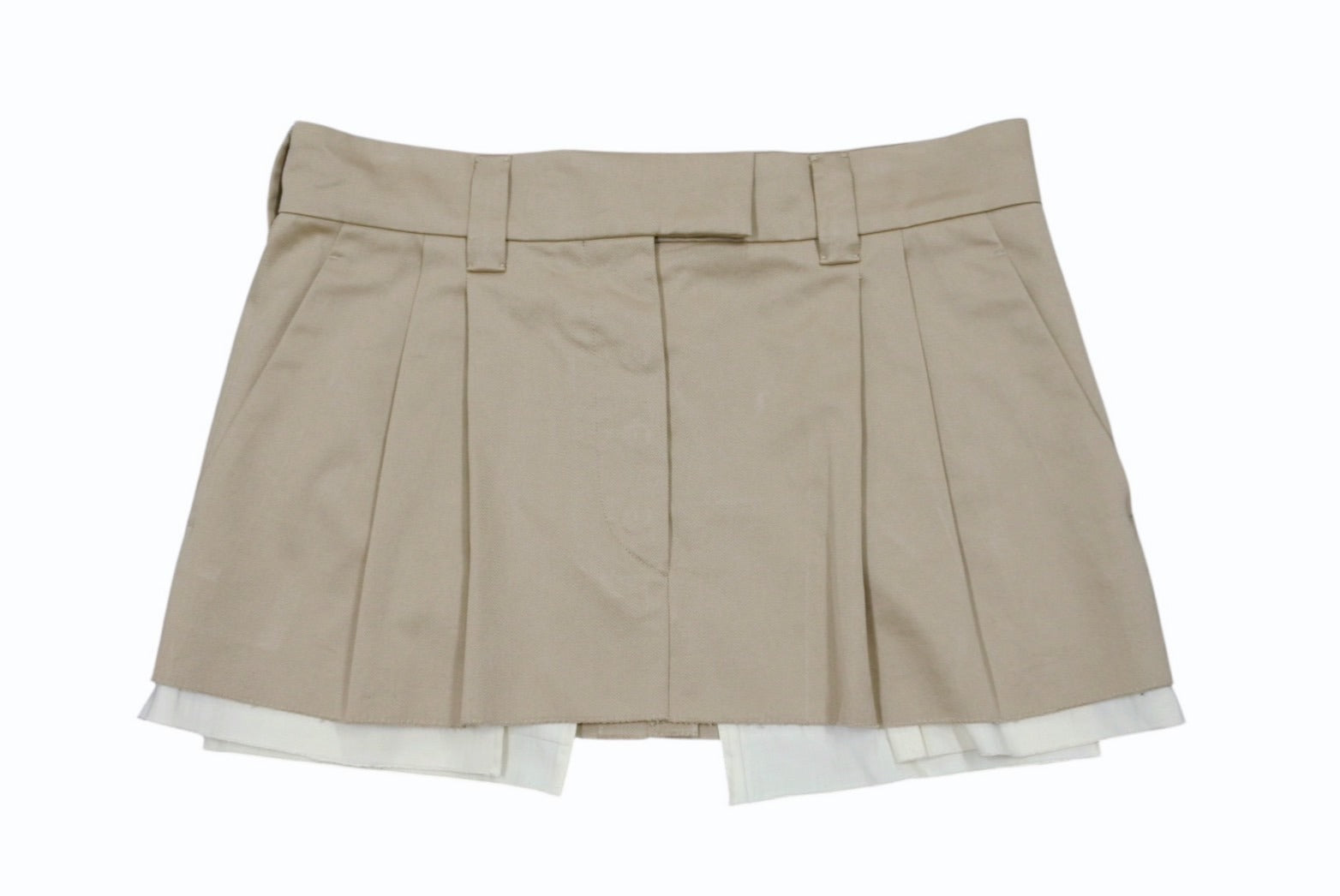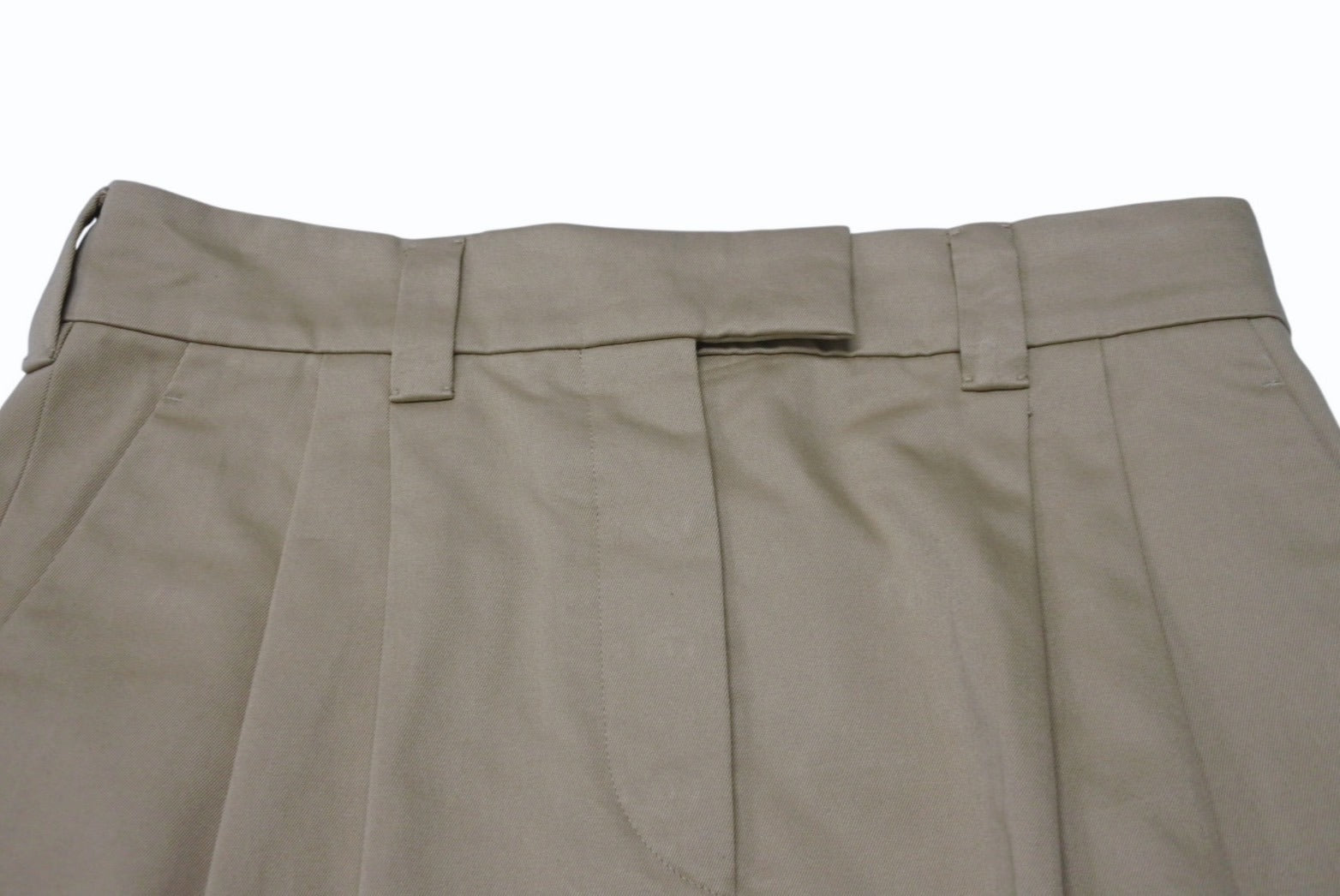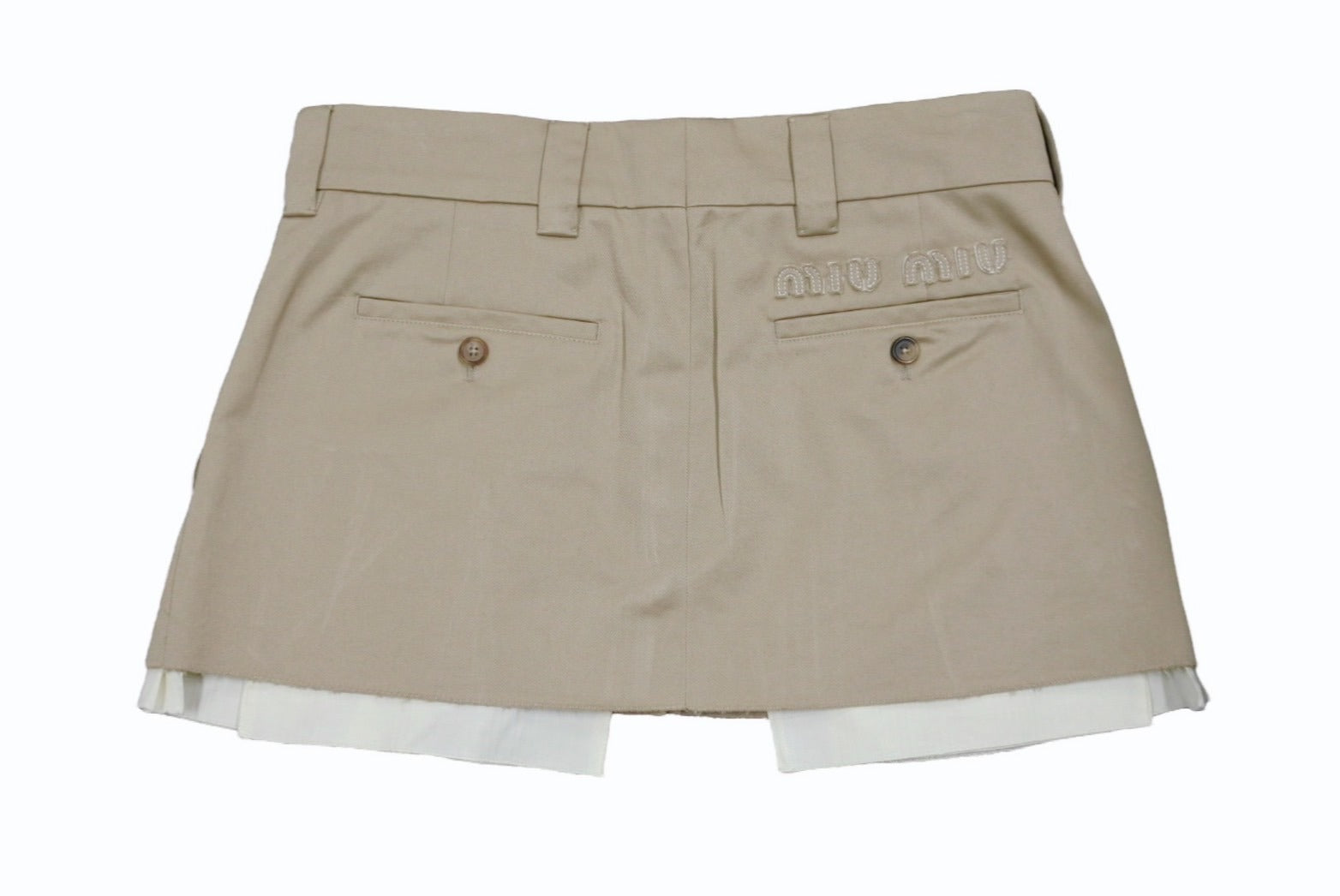 クラシックなテーラリングの常識を覆し、ミュウミュウの大胆なビジョンを通じてイメージを一新。バランスを変えることで新しいプロポーションを生み出し、新たな意味を与えたクラシックなレディスウェアのチノ ミニスカートです。