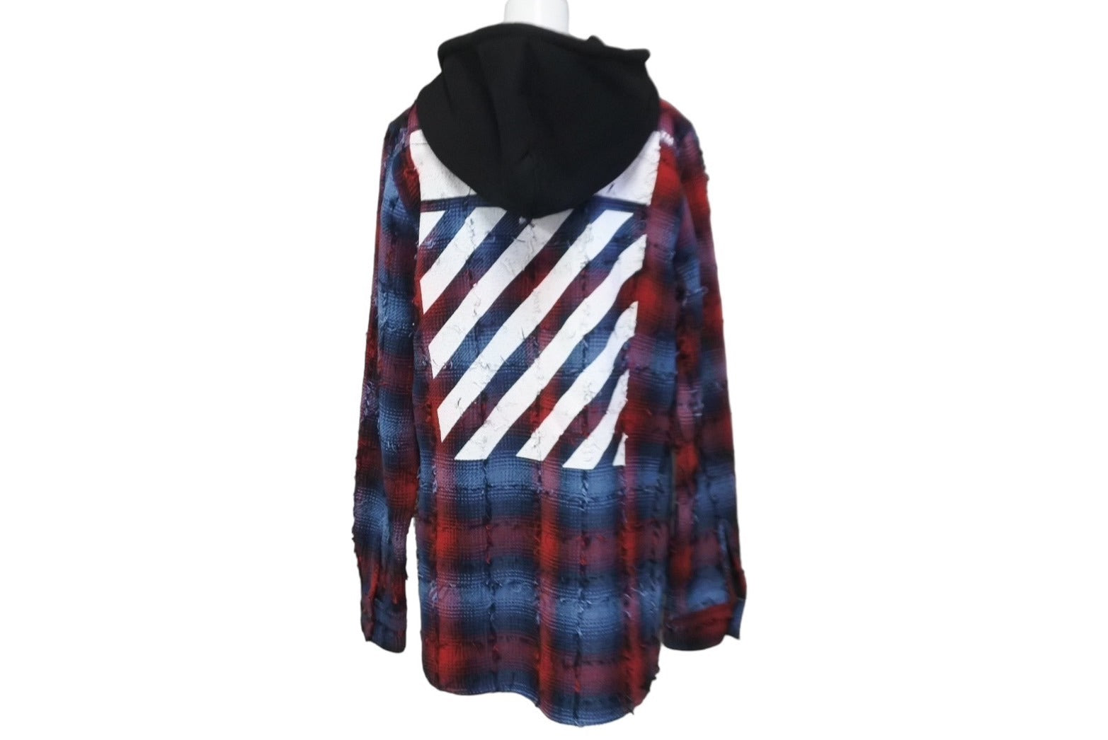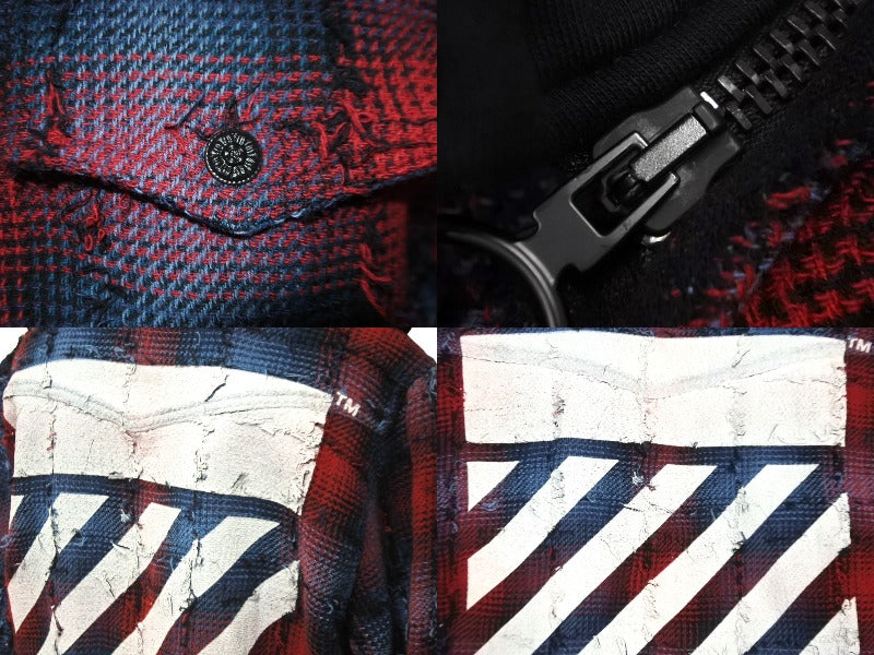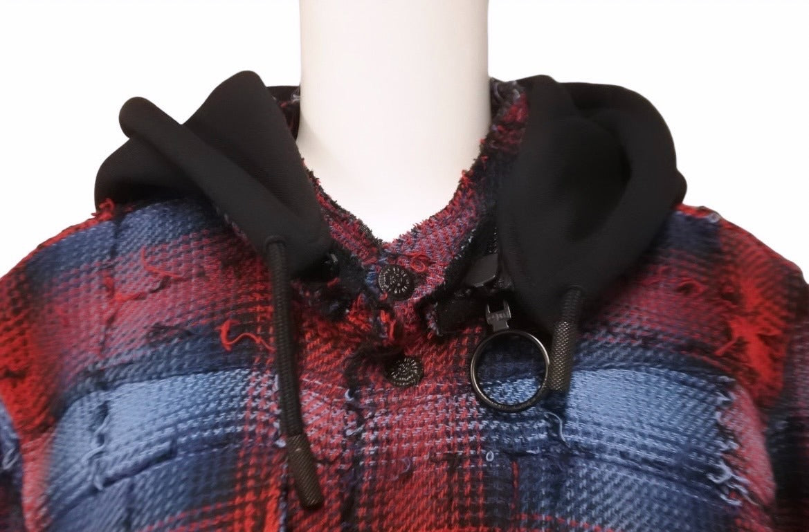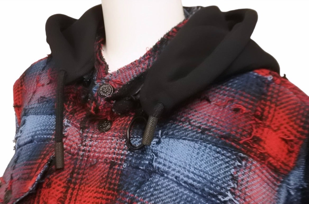 全体的に糸ほつれしてるようなデザインが特徴的で、取り外し可能なフードもあり魅力的でオシャレなアイテムです。