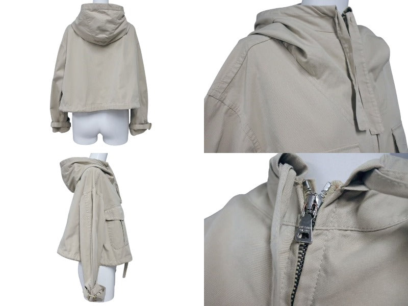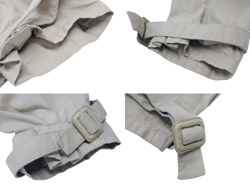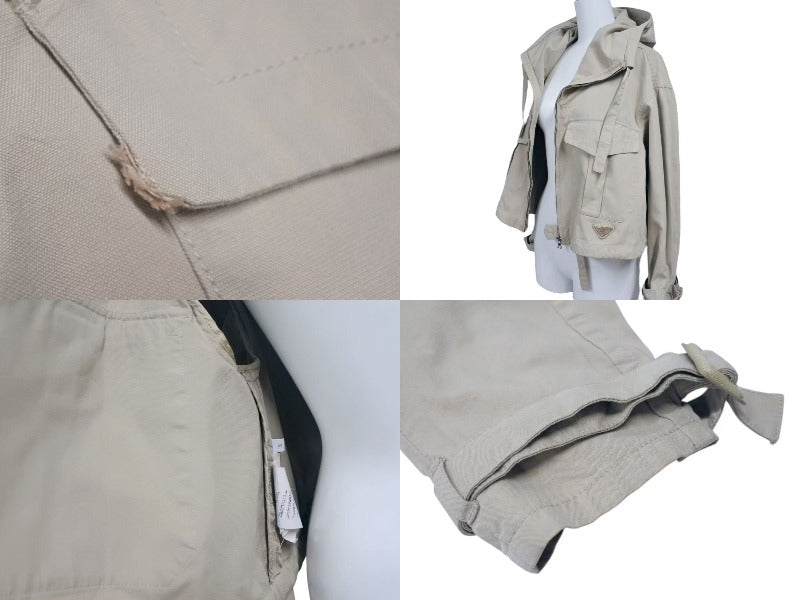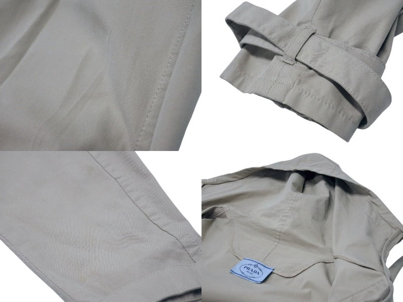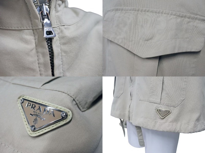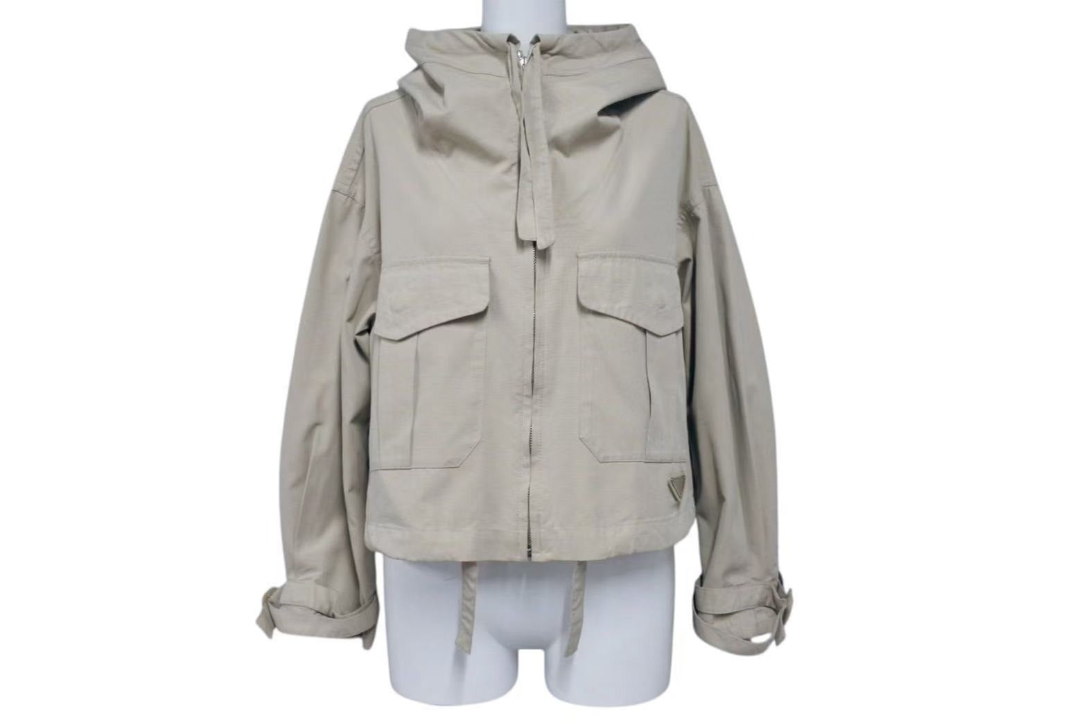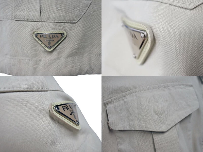 ベージュトーンのコットンxポリエステルギャバジンにトライアングルメタルロゴが光る、プラダ流"ミリタリーxシティ"の到達点。