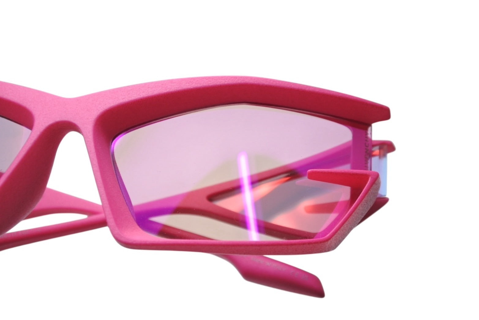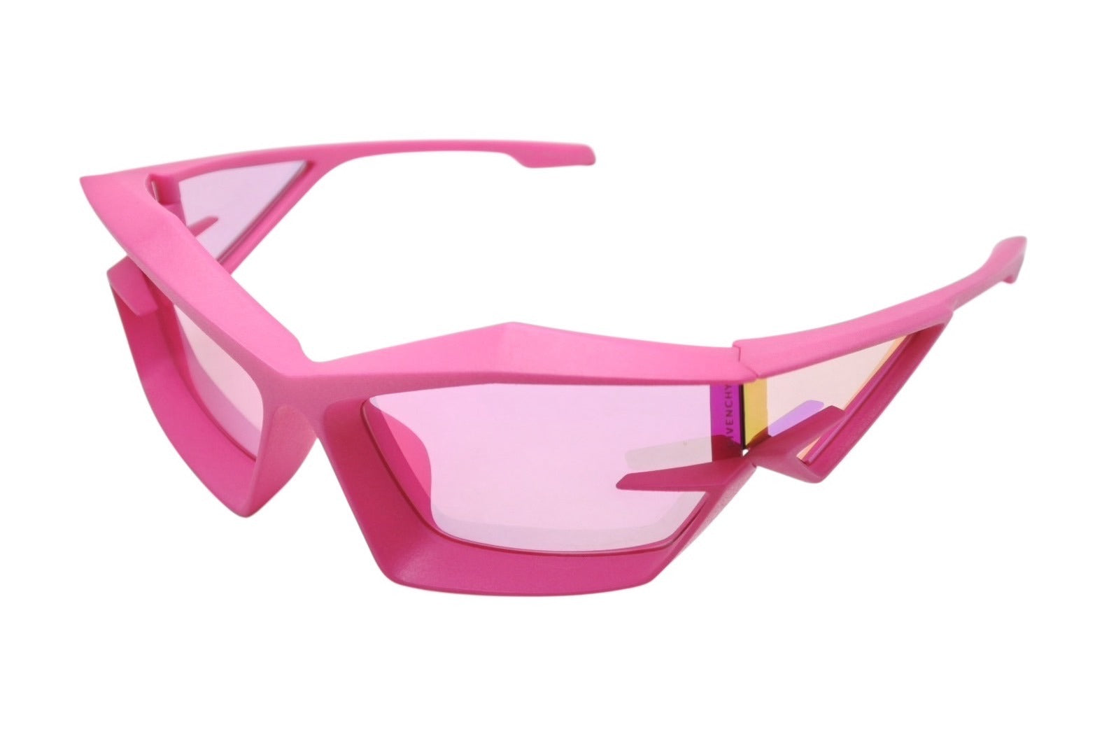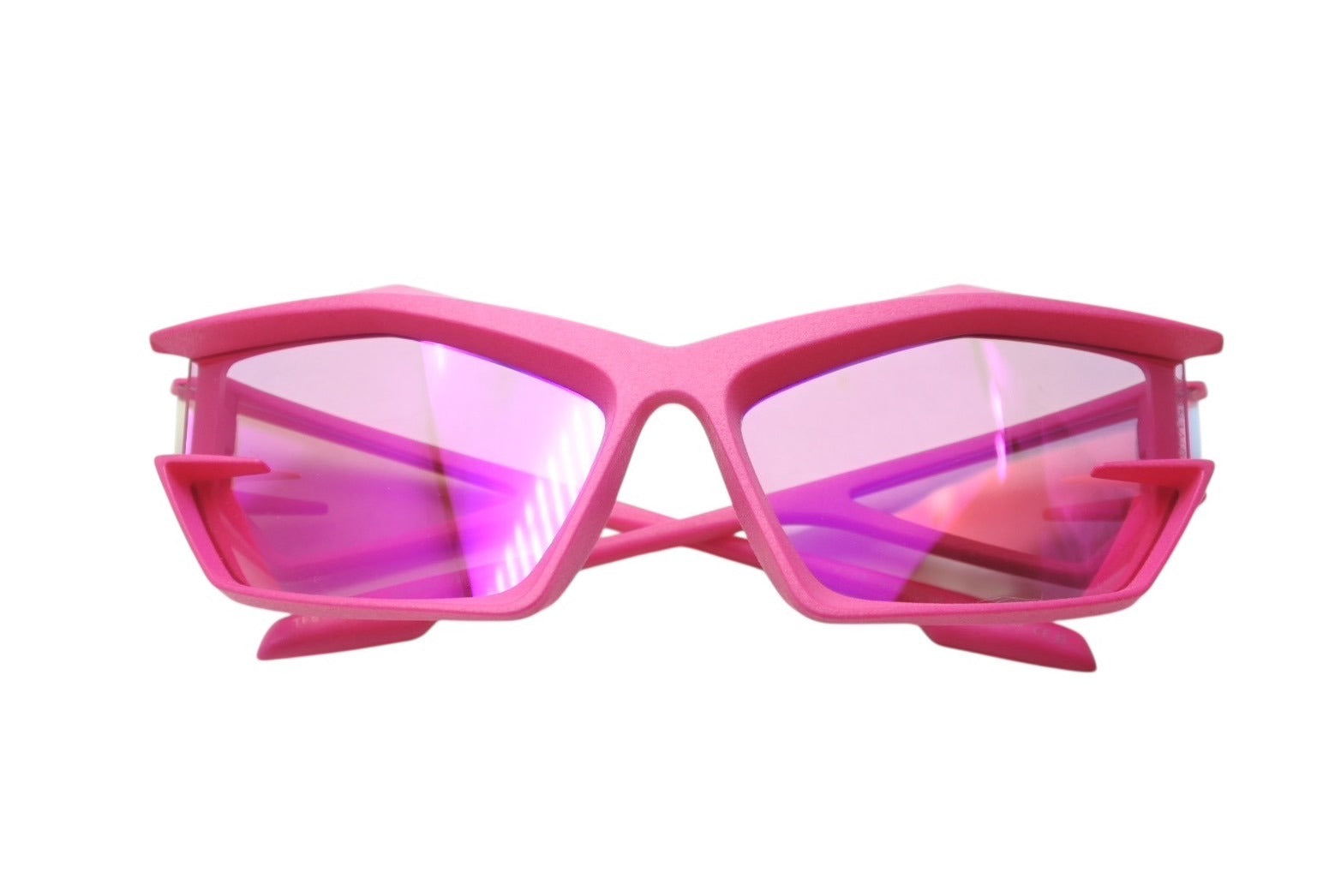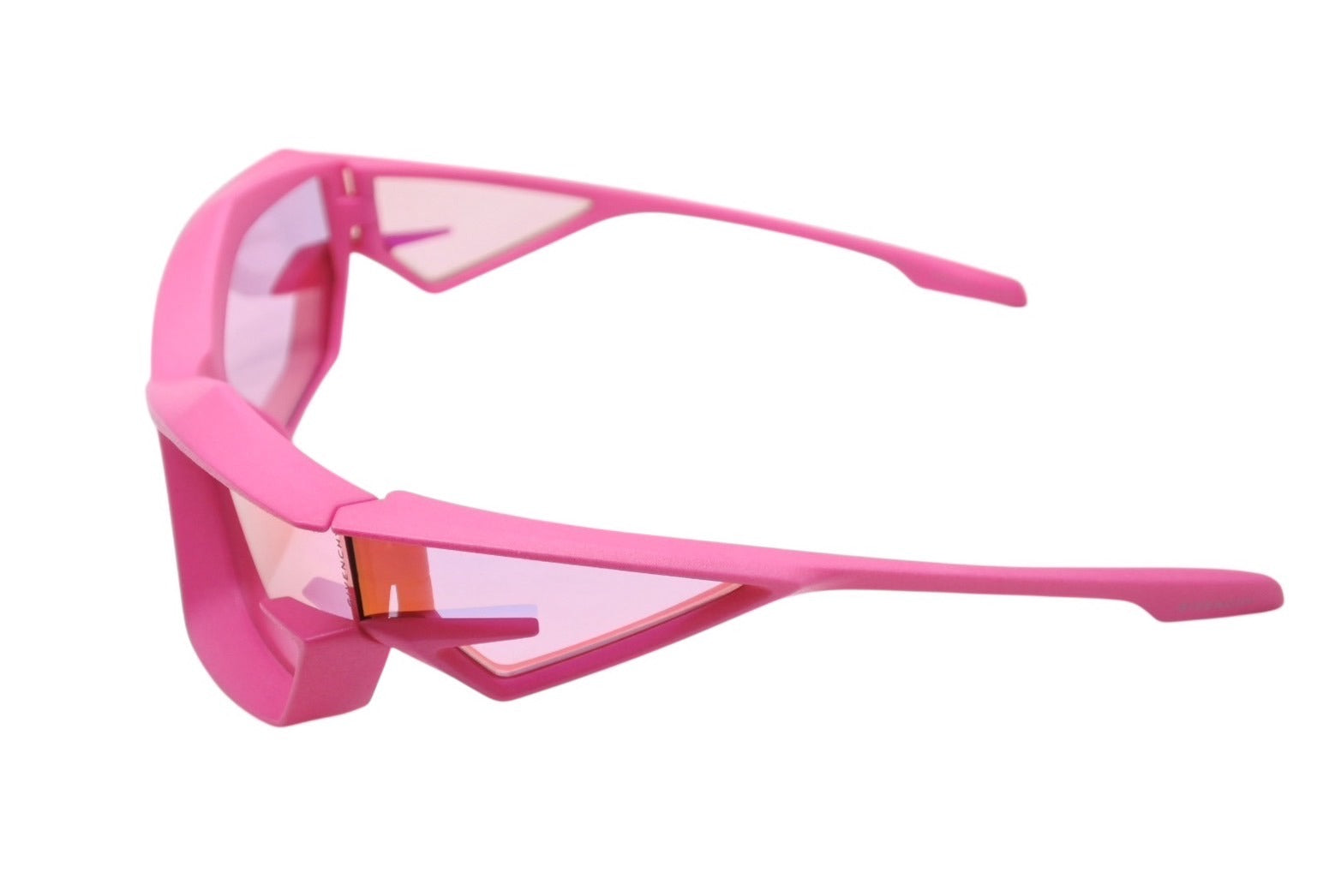 鮮やかなピンクカラーが目を惹くサングラスです。
