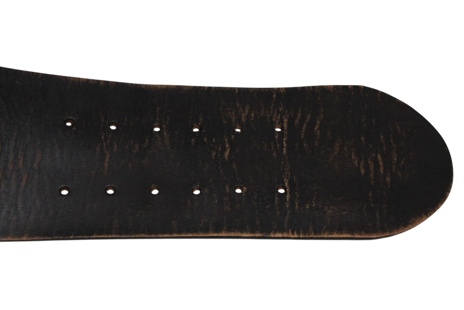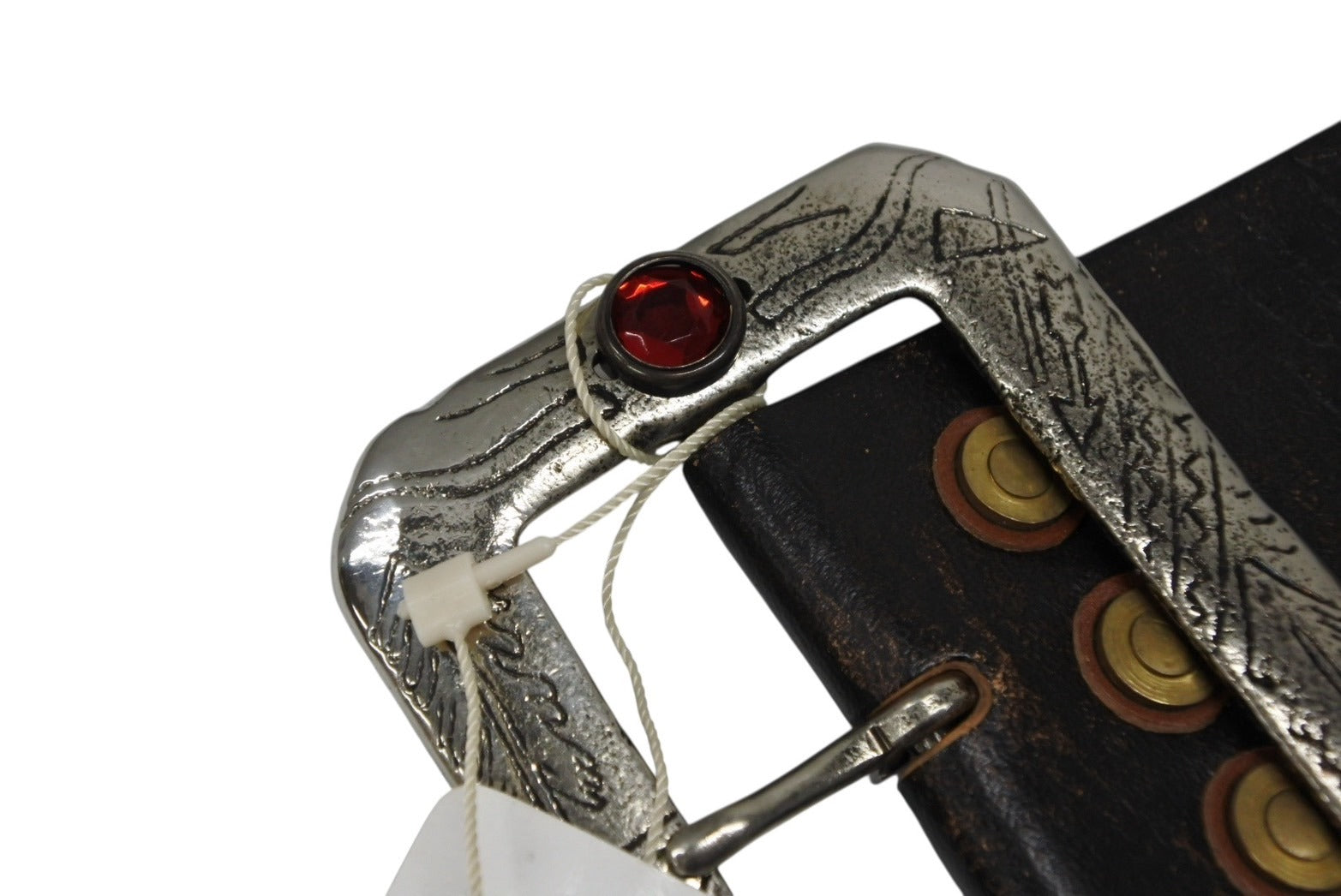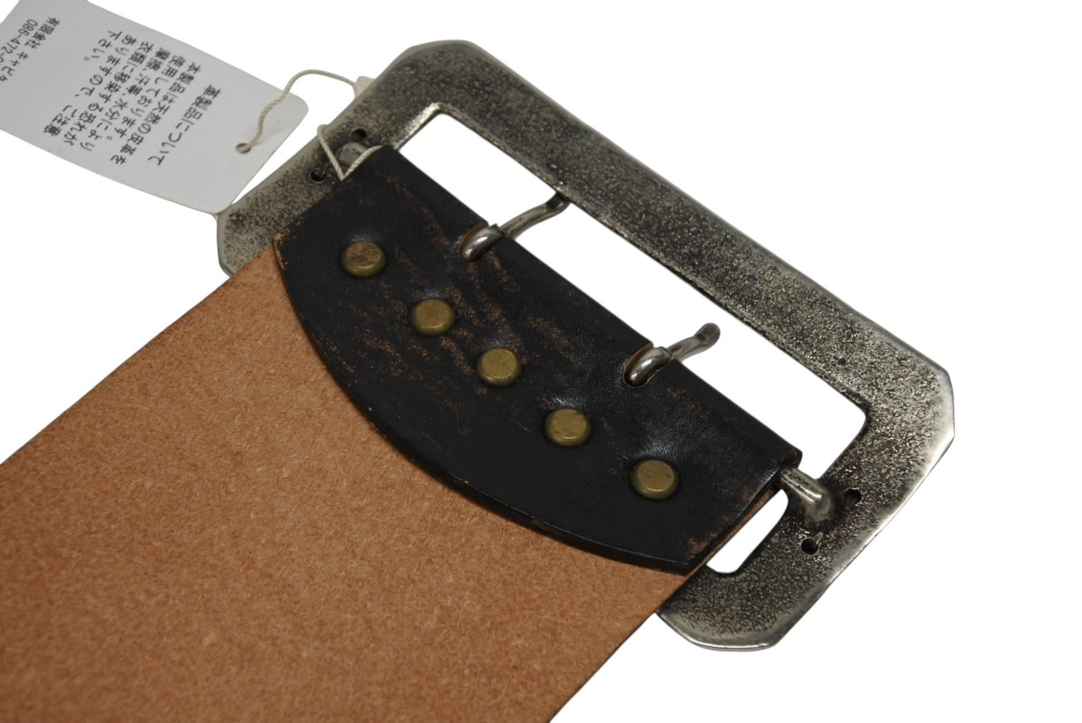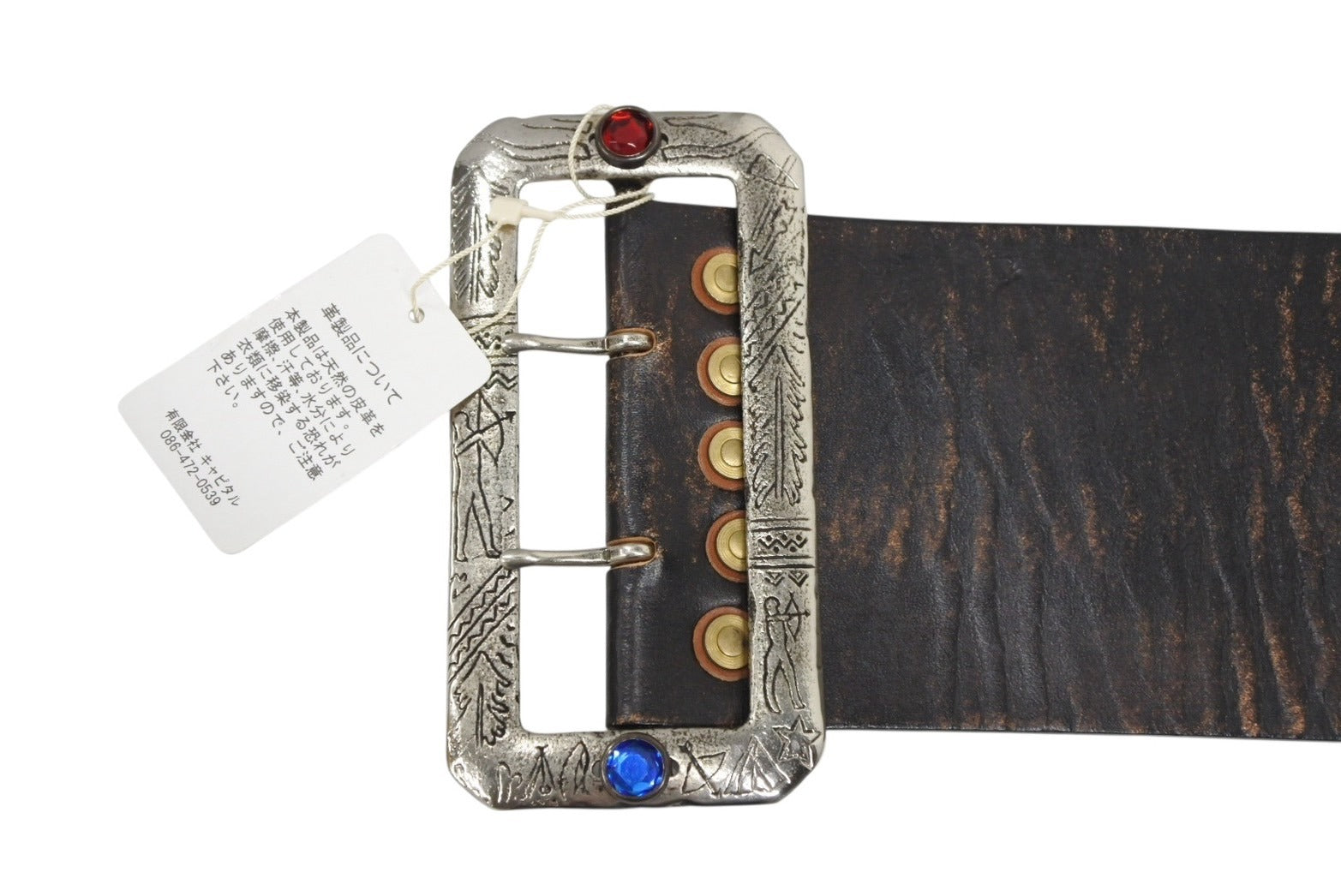 ヴィンテージのような風合いのオイルレザーにカラフルなスタッズとシルバー金具の組み合わせがかっこいいレザーベルトです。