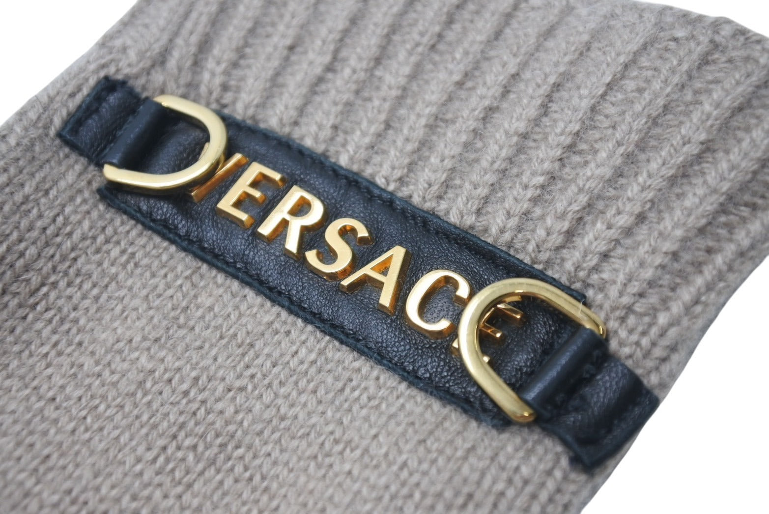 VERSACE ヴェルサーチ 手袋 指ぬきグローブ フィンガーレス手袋 GLOVES ベージュ カシミヤ レザー ゴールド金具 美品 中古 4c070101