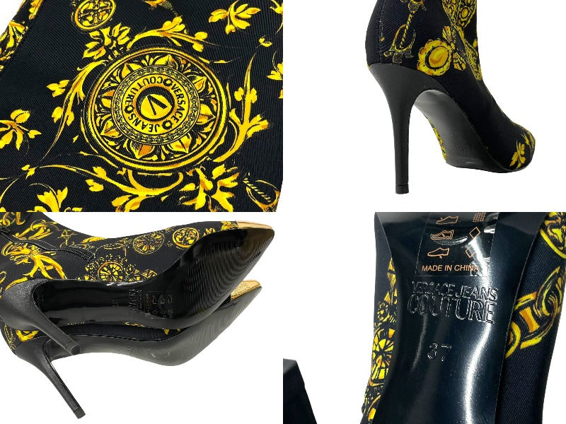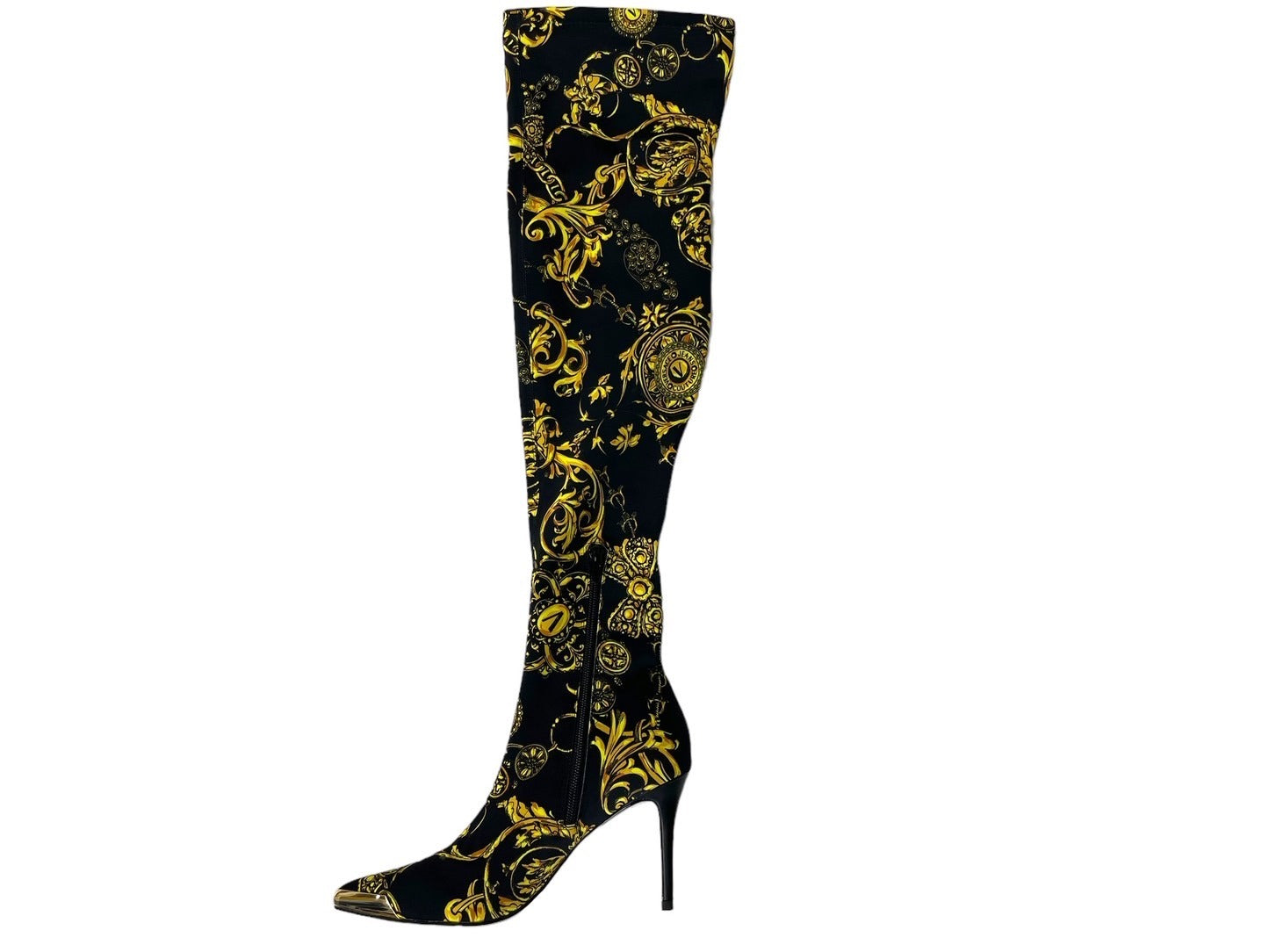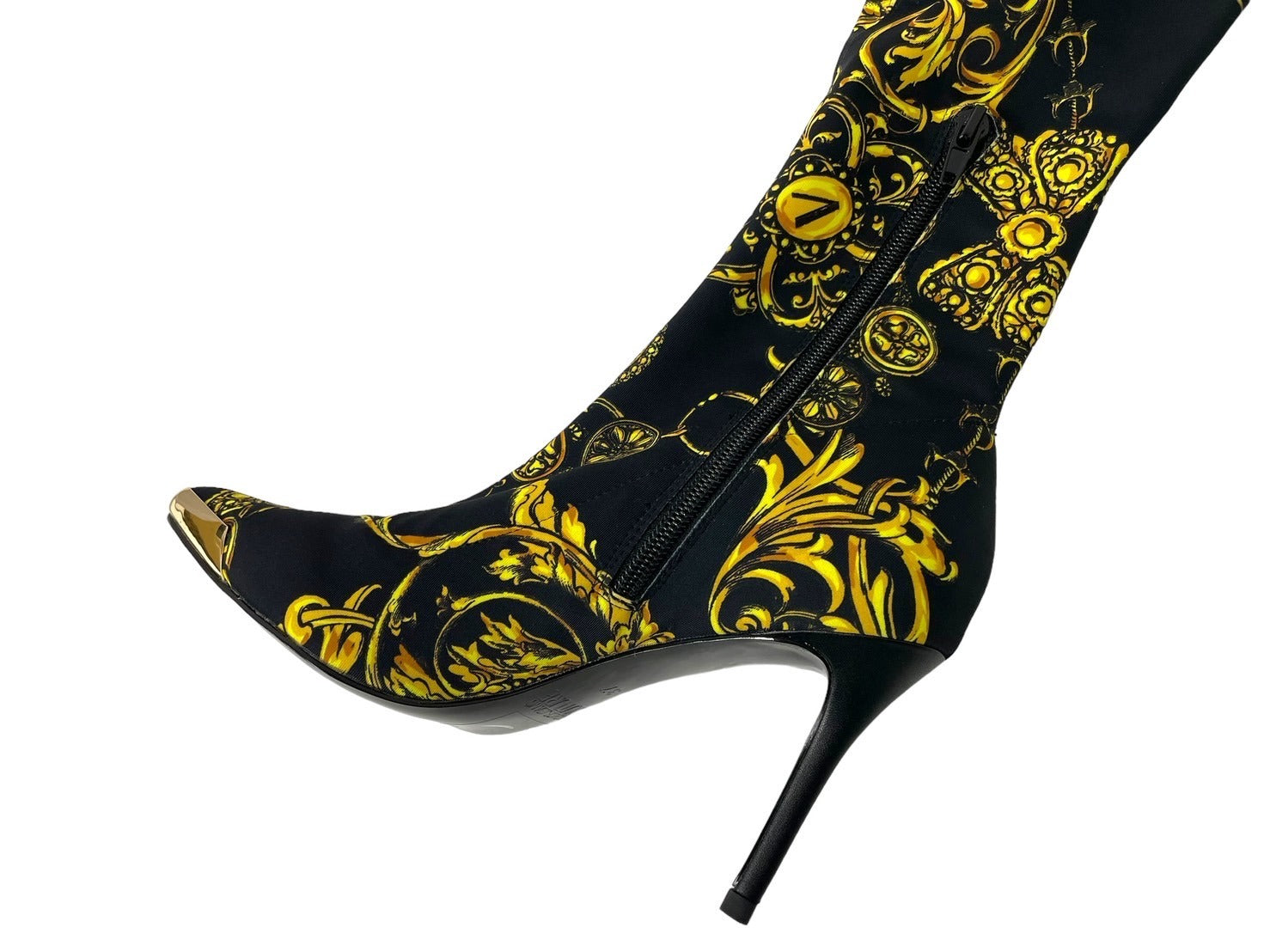 ヴェルサーチで人気のバロック柄を用いたロングのブーツでつま先にプレートが施された個性的で存在感のあるアイテムです。