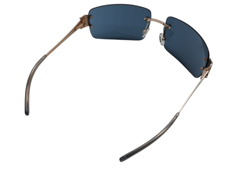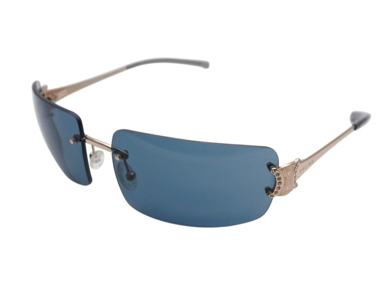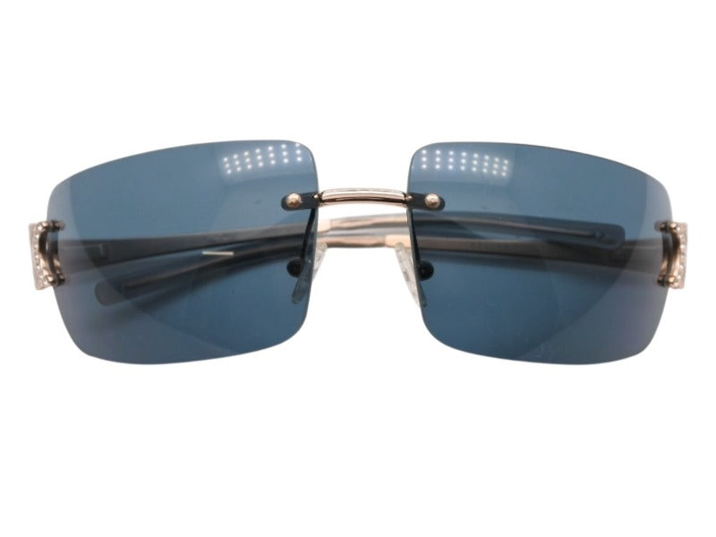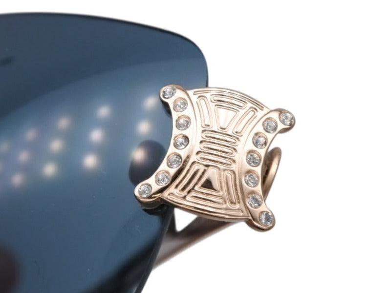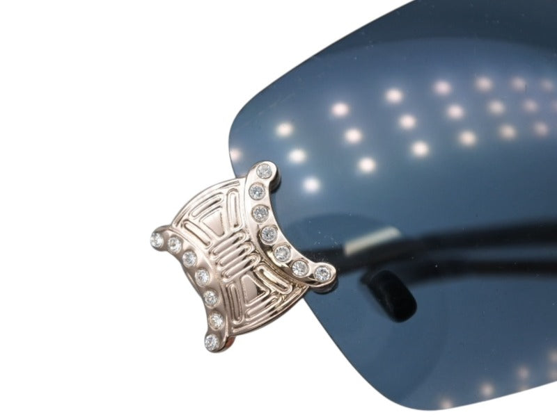 ラインストーンがあしらわれたトリオンフ金具が可愛らしいリムレスサングラスです。