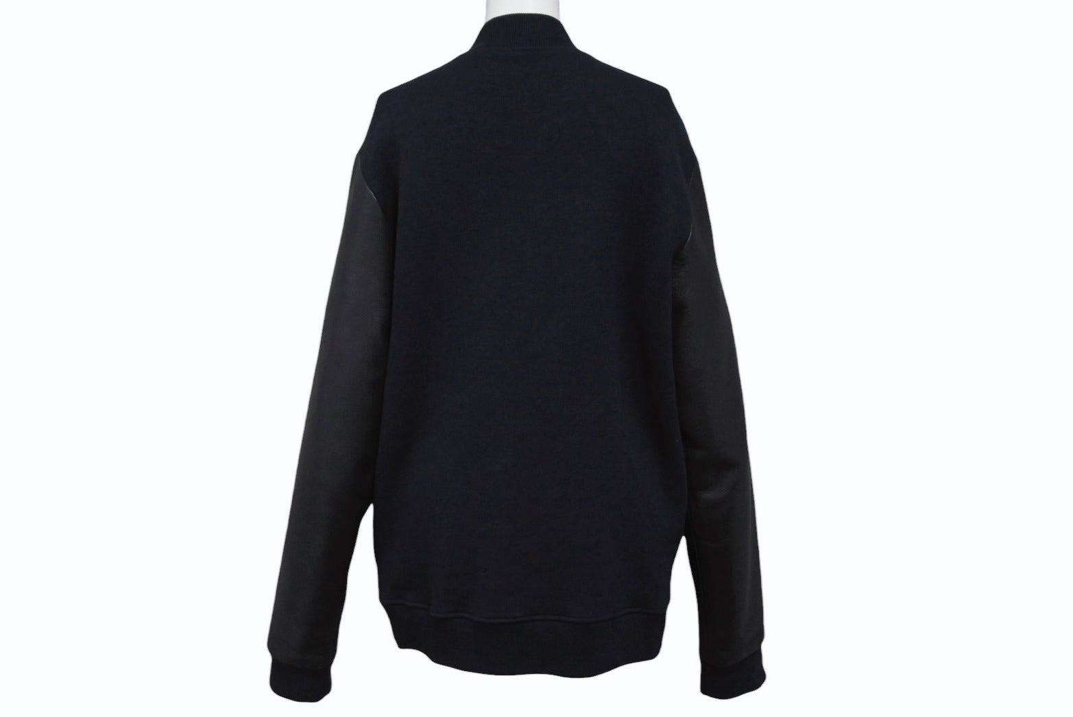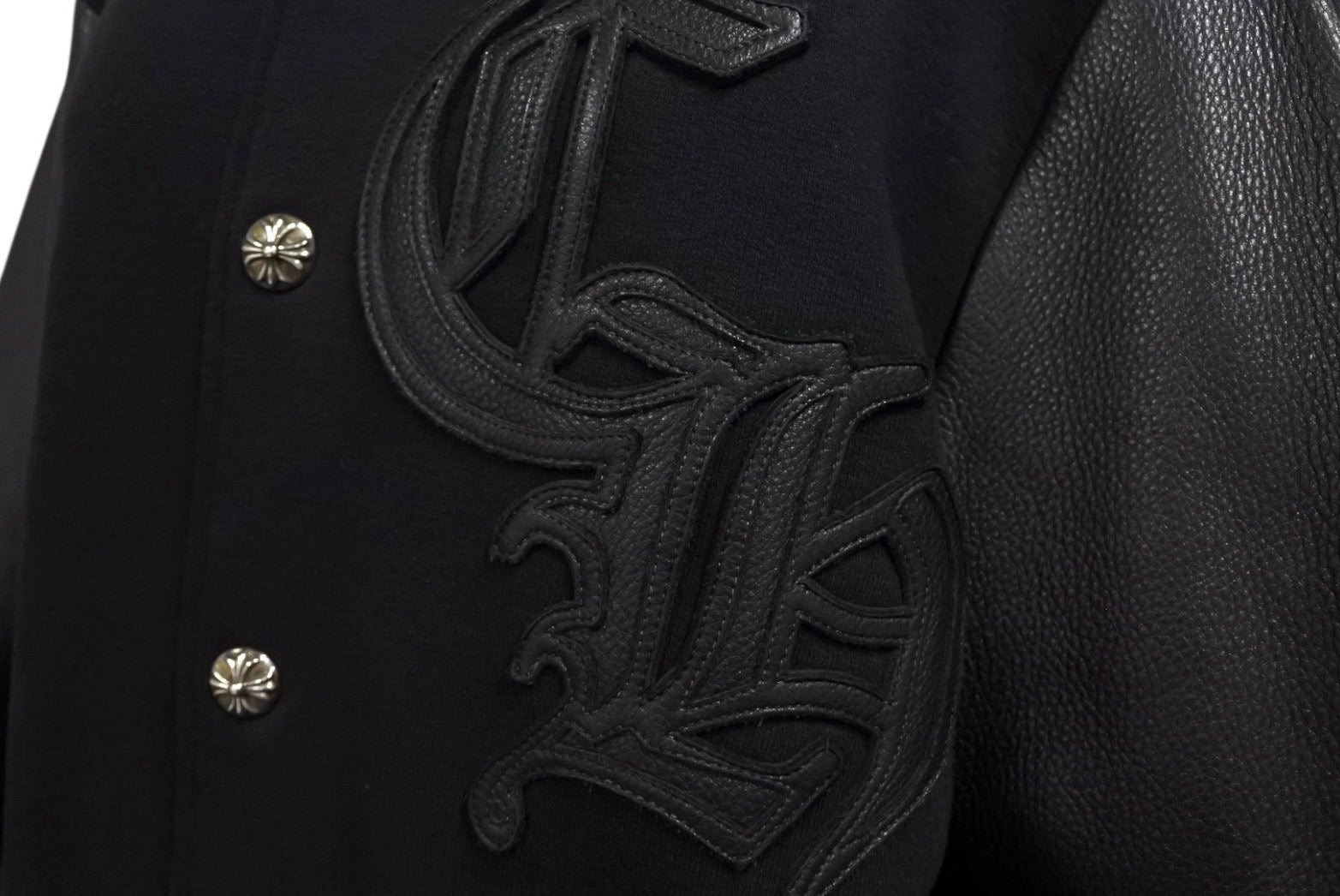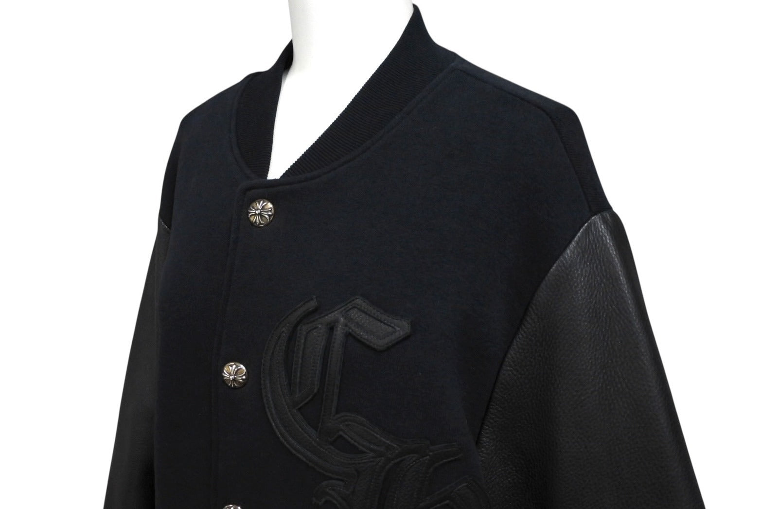 CHレザーパッチとクロスボールボタンが目を惹くバーシティジャケットです。